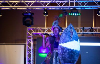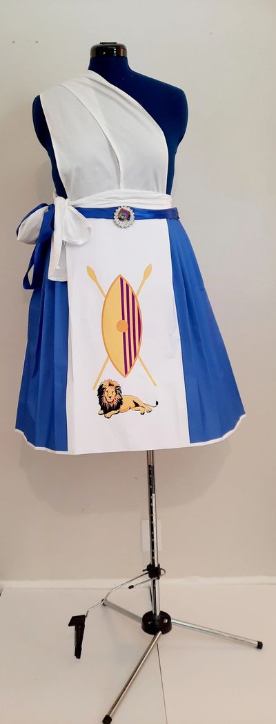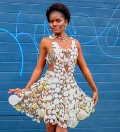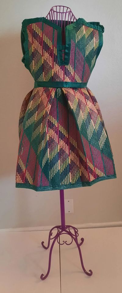 Layers of wrapping paper dress with straps and waist belt mad of belt.